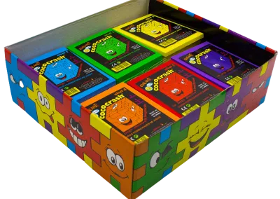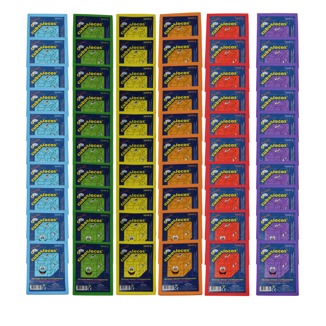 🧩 Se suministran en un expositor de 60 unidades con diez CubosLocos de cada nivel. Hay 6 niveles de dificultad diferentes. Cada nivel está representado por un color.